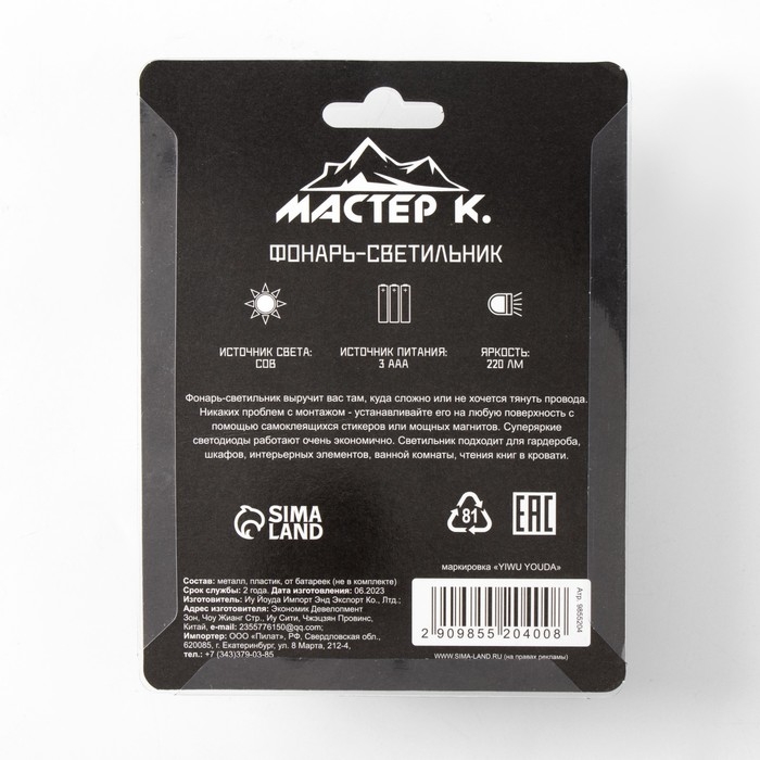 Фонарь-светильник "Мастер К", 220 лм, COB, 3 ААА, магнит, клейкая основа, 9 х 8.8 х 2.8 см