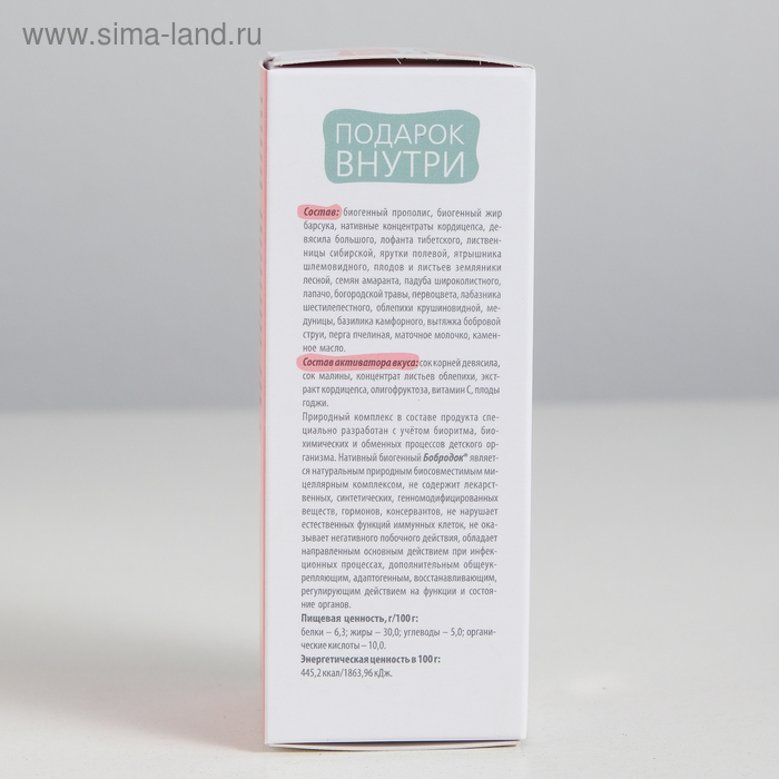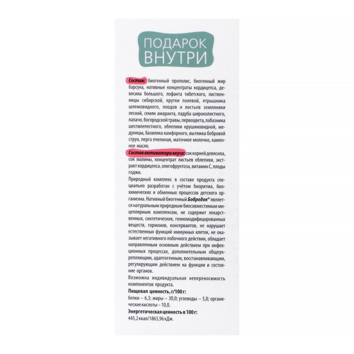 Состав: биогенный прополис, биогенный жир барсука, нативные концентраты кордицепса, девясила большого, лофанта тибетского, лиственницы сибирской, ярутки полевой, ятрышника шлемовидного, плодов и листьев земляники лесной, семян амаранта, падуба широколистного, лапачо, богородской травы, первоцвета, донника лекарственного, лабазника шестилепестного, облепихи крушиновидной, медуницы, базилика камфорного, вытяжка бобровой струи, перга пчелиная, маточное молочко, каменное масло.