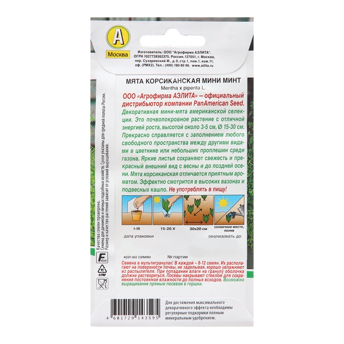Прекрасная декоративная мини-мята от американской компании PanAmerican Seed. Растение почвопокровное, с отличной энергией роста, высотой 3-5 см и диаметром 15-30 см. Прекрасно справится с заполнением любого пространства. Яркая листва сохраняет свежесть и прекрасный внешний вид с весны и до поздней осени. Мята корсиканская заполняет пространство в саду приятным ароматом. Очень декоративно смотрится в высоких кашпо. Подойдет для замены небольших участков газона. Не употреблять в пищу!Семена в гранулах! Гранулы располагают на поверхности почвы, не заделывая их, хорошо увлажняют из распылителя. При попадании влаги на гранулу оболочка должна раствориться. Посевы накрывают стеклом для сохранения постоянной влажности до полных всходов. Возможно выращивание прямым посевом в горшки.