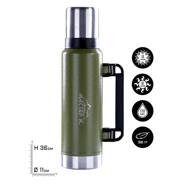 Термос, 1.2 л, Движение, "Мастер К.", с кружкой, сохраняет тепло 18 ч, 36 х 11 см, зелёный