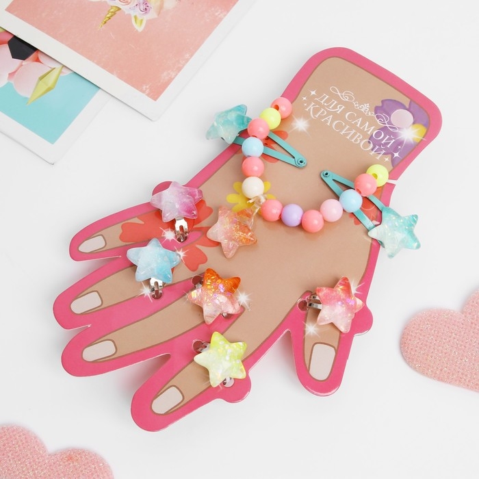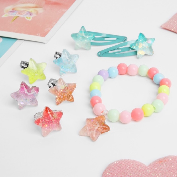 Комплект детский «Выбражулька» 6 предметов: 2 заколки, браслет, 5 колец, звёзды, цветной