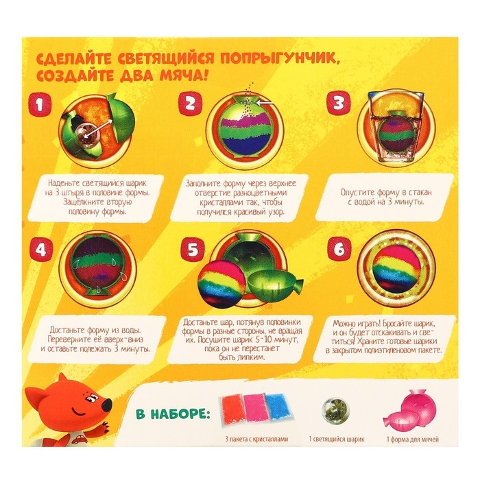 С набором для опытов «Ми-ми-мишки: Прыгающий мяч» ребёнок проведёт химический эксперимент и узнает, как создать светящиеся мячики.