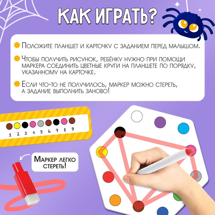 - Чтобы получить рисунок, нужно с помощью маркера соединить цветные круги на планшете по порядку, указанному на карточке.