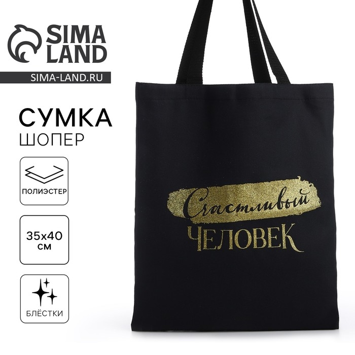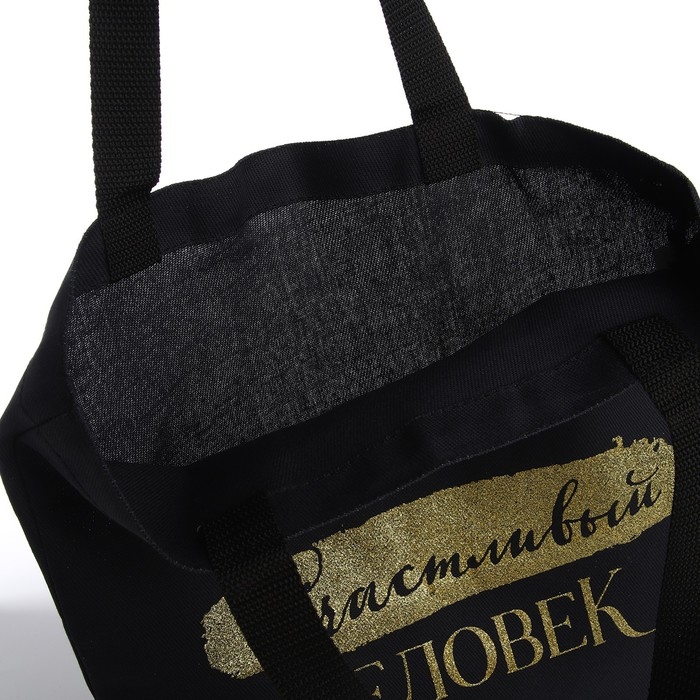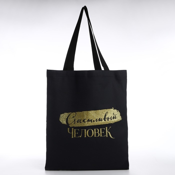 Шопер "Счастливый человек", 35х0,5х40, принт с блёстками, без подклада, чёрный