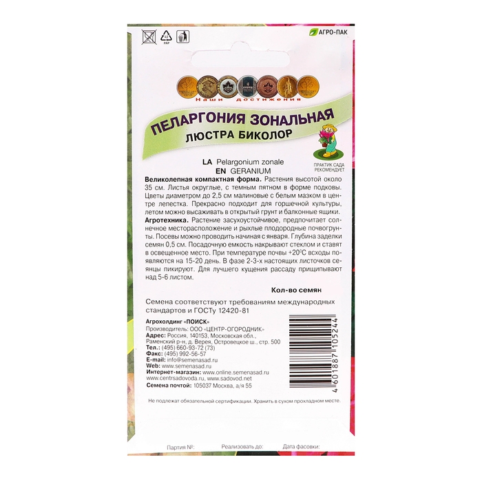 Великолепная компактная форма. Растения высотой около 35 см. Листья округлые, с темным пятном в форме подковы. Цветы диаметром до 2,5 см малиновые с белым мазком в центре лепестка. Прекрасно подходит для горшечной культуры, летом можно высаживать в открытый грунт и балконные ящики.Растение засухоустойчивое, предпочитает солнечное месторасположение и рыхлые плодородные почвогрунты. Посевы можно проводить начиная с января. Глубина заделки семян 0,5 см. Посадочную емкость накрывают стеклом и ставят в освещенное место. При температуре почвы +20°С всходы появляются на 15-20 день. В фазе 2-3-х настоящих листочков сеянцы пикируют. Для лучшего кущения рассаду прищипывают над 5-6 листом.Семена соответствуют требованиям международных стандартов и ГОСТу РФ 12420-81
