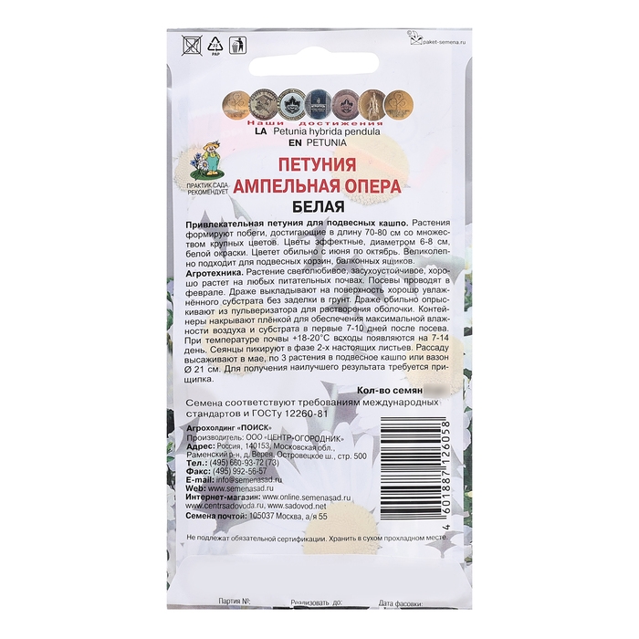 Привлекательная петуния для подвесных кашпо. Растения формируют побеги, достигающие в длину 70-80 см со множеством крупных цветов. Цветы эффектные, диаметром 5-6 см, нарядные белые. Цветет обильно с июня по октябрь.Великолепно подходит для подвесных корзин, балконных ящиков.Агротехника. Растение светолюбивое, засухоустойчивое, хорошо растет на любых питательных почвах. При выращивании рассады посевы проводят в феврале-марте. Драже слегка вдавливают в почву. Посадочную емкость накрывают стеклом и ставят в освещенное место. При температуре +18°C всходы появляются на 14-20 день. Сеянцы пикируют в фазе 2 настоящих листьев. Рассаду высаживают после окончания весенних заморозков. Семена соответствуют требованиям международных стандартов и ГОСТу РФ 12260-81