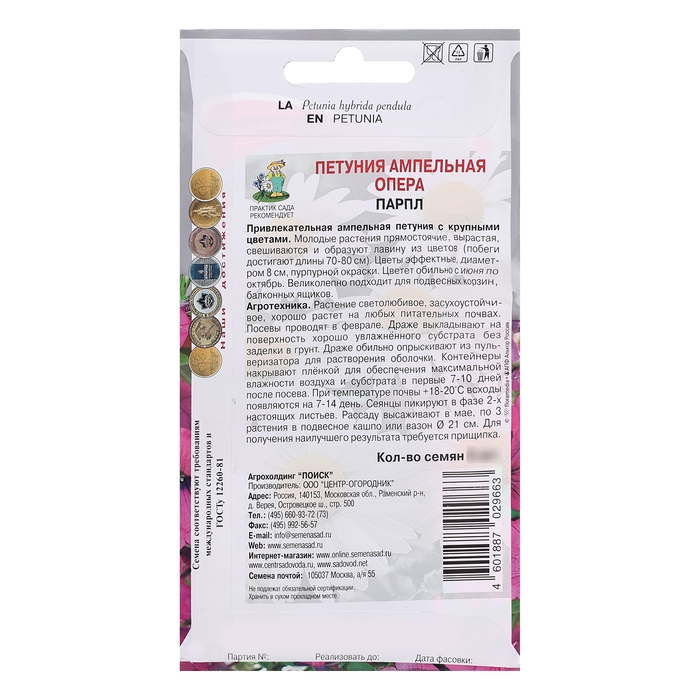 Привлекательная ампельная петуния с крупными цветами. Молодые растения прямостоячие, вырастая, свешиваются и образуют лавину из цветов (побеги достигают длины 70-80 см). Цветы эффектные, диаметром 8 см, пурпурной окраски. Цветет обильно с июня по октябрь. Великолепно подходит для подвесных корзин, балконных ящиков.Агротехника. Растение светолюбивое, засухоустойчивое, хорошо растет на любых питательных почвах. Посевы проводят в феврале. Драже выкладывают на поверхность хорошо увлажнённого субстрата без заделки в грунт. Драже обильно опрыскивают из пульверизатора для растворения оболочки. Контейнеры накрывают плёнкой для обеспечения максимальной влажности воздуха и субстрата в первые 7-10 дней после посева. При температуре почвы +18-20°C всходы появляются на 7-14 день. Сеянцы пикируют в фазе 2-х настоящих листьев. Рассаду высаживают в мае, по 3 растения в подвесное кашпо или вазон Ø 21 см. Для получения наилучшего результата требуется прищипка. Семена соответствуют требованиям международных стандартов и ГОСТу РФ 12260-81