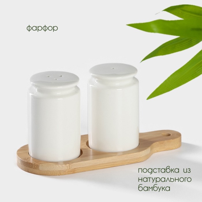 Набор фарфоровый для специй на бамбуковой подставке BellaTenero, 3 предмета: солонка 90 мл, перечница 90 мл, подставка, цвет белый