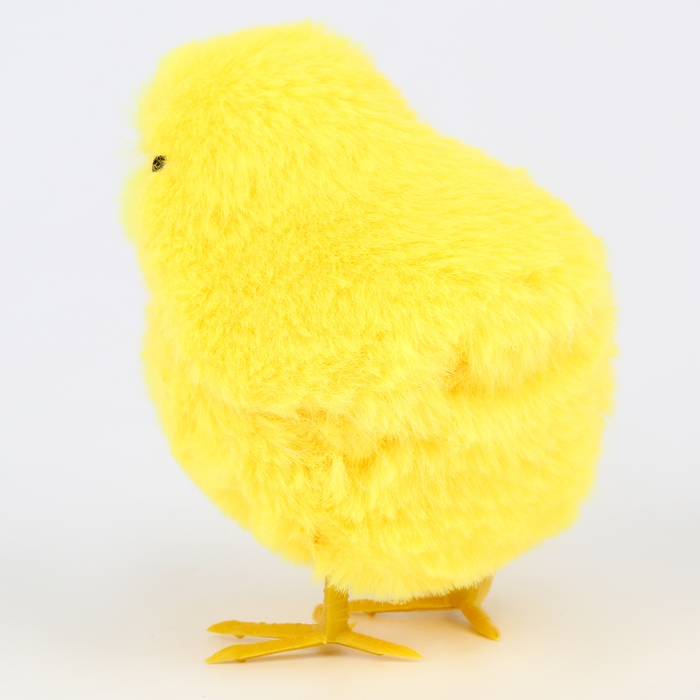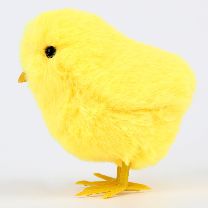 - Тело цыплёнка изготовлено из мягкого на ощупь искусственного меха, а клюв и лапки — из пластика.