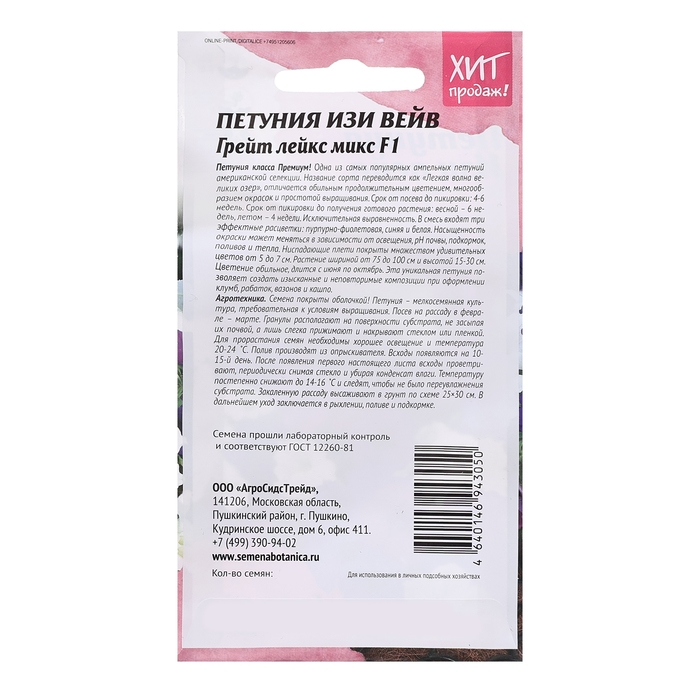 Знаменитый ампельный гибрид многоцветковой петунии, удивляющий своим обильным цветением от американской компании PanAmerican Seed. Характеризуется длительным периодом цветения и устойчивостью к неблагоприятным условиям. Дословно название серии переводится, как «легкая волна», это действительно так же красиво - целью селекции было создание легкого в уходе и хорошо растущего в условиях короткого светового дня растения. Ниспадающие плети покрыты множеством удивительных миниатюрных цветов. Данная серия наращивает массу растения сначала "куполом", достигая 25-38 см в ширину и диаметром 15-30 см, формируя в последствии плети до 1 метра, обильно усыпанные крупными цветками. Цветение обильное, длится с июня по октябрь. Этот уникальный гибрид позволяет создать изысканные и неповторимые композиции при оформлении клумб, рабаток, вазонов и кашпо. Также петунию данной серии смело можно сажать в балконные ящики. Агротехника: Семена покрыты оболочкой! Петуния – мелкосемянная культура, требовательная к условиям выращивания. Посев на рассаду в феврале-марте. Гранулы располагают на поверхности субстрата, не засыпая их почвой, а лишь слегка прижимают и накрывают стеклом или пленкой. Для прорастания семян необходимо хорошее освещение и температура 20-24˚С. Полив производят из опрыскивателя. Всходы появляются на 10-15 день. После появления первого настоящего листа всходы проветривают, периодически снимая стекло и убирая конденсат влаги. Температуру постепенно снижают до 14-16˚С и следят, чтобы не было переувлажнения субстрата. Закаленную рассаду высаживают в грунт по схеме 25×30 см. В дальнейшем уход заключается в рыхлении, поливе и подкормах. Штрих-код –