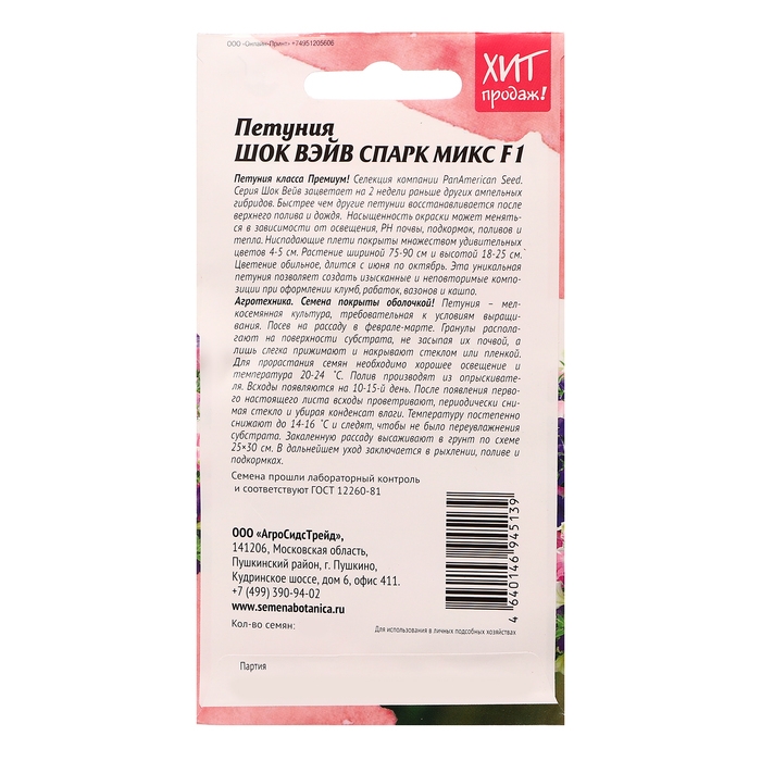 Петуния класса Премиум! Селекция компании PanAmerican Seed. Серия Шок Вейв зацветает на 2 недели раньше других ампельных гибридов. Быстрее чем другие петунии восстанавливается после верхнего полива и дождя. Оригинальная окраска от нежной серебристо-лавандовой до темно-синей. Насыщенность окраски может меняться в зависимости от освещения, PH почвы, подкормок, поливов и тепла. Ниспадающие плети покрыты множеством удивительных цветов 4-5 см. Растение шириной 75-90 см и высотой 18-25 см. Цветение обильное, длится с июня по октябрь. Эта уникальная петуния позволяет создать изысканные и неповторимые композиции при оформлении клумб, рабаток, вазонов и кашпо. Агротехника: Семена покрыты оболочкой! Петуния – мелкосемянная культура, требовательная к условиям выращивания. Посев на рассаду в феврале-марте. Гранулы располагают на поверхности субстрата, не засыпая их почвой, а лишь слегка прижимают и накрывают стеклом или пленкой. Для прорастания семян необходимо хорошее освещение и температура 20-24˚С. Полив производят из опрыскивателя. Всходы появляются на 10-15 день. После появления первого настоящего листа всходы проветривают, периодически снимая стекло и убирая конденсат влаги. Температуру постепенно снижают до 14-16˚С и следят, чтобы не было переувлажнения субстрата. Закаленную рассаду высаживают в грунт по схеме 25×30 см. В дальнейшем уход заключается в рыхлении, поливе и подкормах. Штрих-код –