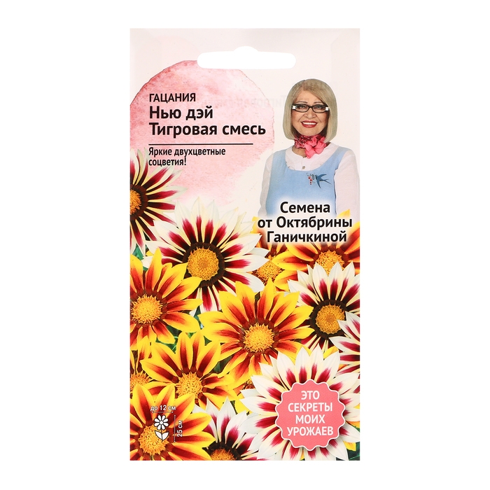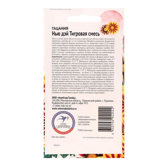 Один из самых ярких однолетников в современном саду или парке. Отличается огромными цветами до 12см в диаметре. Обладает уникальной двуцветной полосатой окраской. Высота растения 25см. Зацветает через 12-13 недель после посева. Гацания предоставляет самые широкие возможности для использования в групповых посадках, партерных цветниках, парковых клумбах. Подходит для оформления рабаток, бордюров, групп, каменистых горок, откосов, будет отлично смотреться в широких уличных вазонах или контейнерах в сочетании с другими низкорослыми мелкоцветковыми однолетниками. Агротехника: выращивают через рассаду под стекло в феврале-апреле. Предпочитает слабокислый субстрат с рН 5,8-6,2. Всходы появляются через 3-7 дней при температуре 21-22°С. Влажность субстрата необходимо поддерживать, но не заливать, так как есть вероятность заболевания серой гнилью в стадии семядолей или первого настоящего листа. Пикировки проводят через 2-3 недели после посева в фазе 2-3-го настоящего листа. Оптимальная температура для развития растений 17-19°С. Избегайте переохлаждения рассады – разница температур День/Ночь – не более 12°С. Высадка рассады в грунт производится после установления стабильной теплой погоды. Предпочитает открытые солнечные места с хорошо дренированной легкой почвой. Избытка влаги не переносит. На тяжелых глинистых почвах, особенно в дождливые годы, чувствует себя угнетенно. Растение жаро и засухоустойчиво. Чтобы сохранить растение можно на зиму его убрать в дом. Для этого в конце сентября внесите пересаженные в ящики или горшки растения в дом и поставьте в светлое помещение с температурой 8-10°С. Поливают зимой очень умеренно, однако не допускают полного пересыхания почвы. Весной, перед высадкой перезимовавших экземпляров в грунт, побеги наполовину укорачивают. Штрих-код -