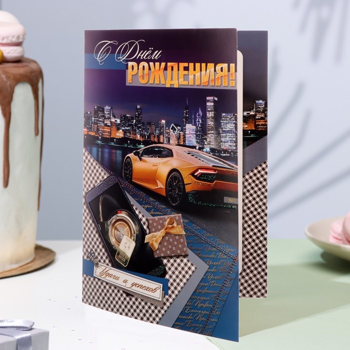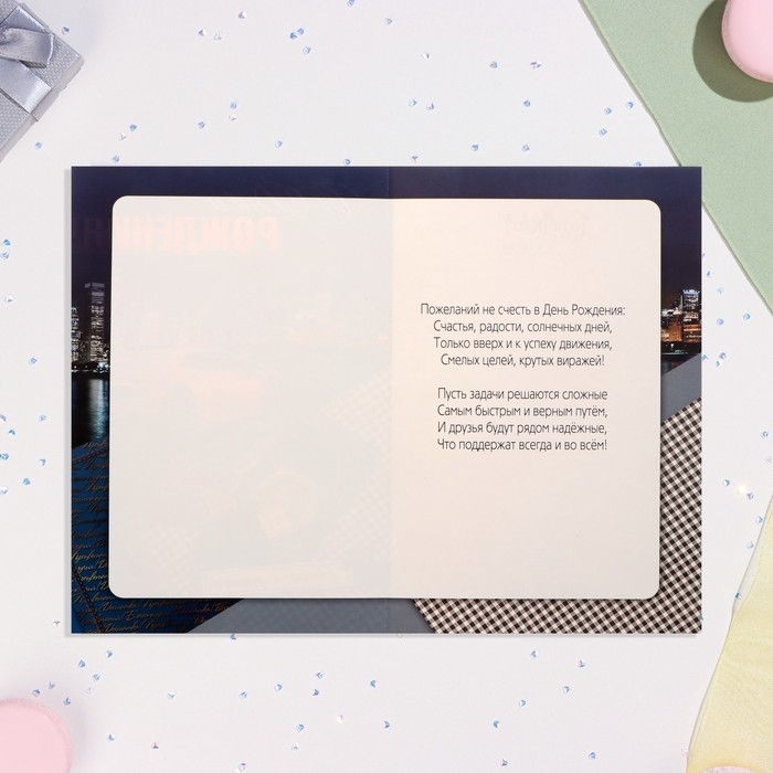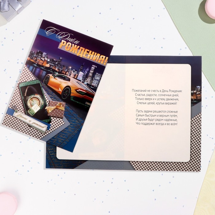 Открытка "С Днём Рождения!" глиттер, автомобиль, А4