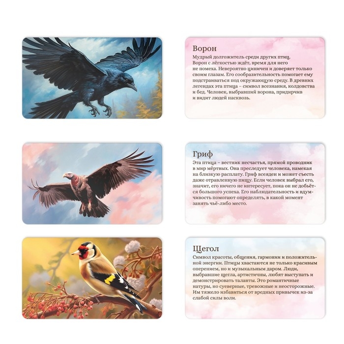 Внутри собрано 50 карт с красочными иллюстрациями птиц – образами, которые символизируют наш личный потенциал и истинное эмоциональное состояние прошлого, настоящего и будущего. При работе с ними вы посмотрите на ту или иную ситуацию иным взглядом и найдете ответы, которые долго не всплывали наружу.
