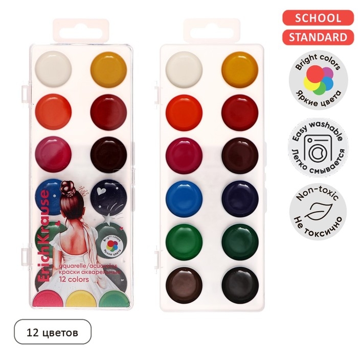 Акварель 12 цветов, ErichKrause Pointes, без кисти, пластиковая коробка, европодвес