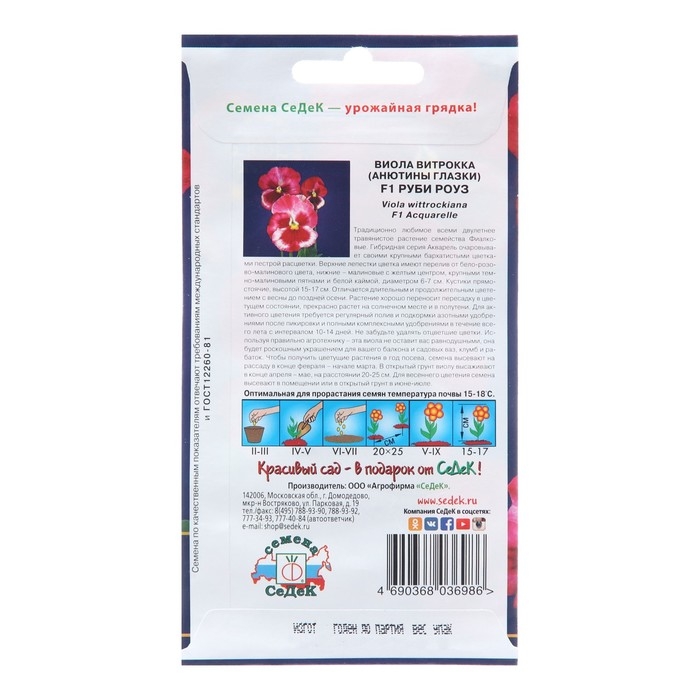 Традиционно любимое всеми двулетнее травянистое растение семейства Фиалковые. Гибридная серия Акварель очаровывает своими крупными бархатистыми цветками пестрой расцветки. Верхние лепестки цветка имеют перелив от бело-розово-малинового цвета, нижние - малиновые с желтым центром, крупными темно-малиновыми пятнами и белой каймой, диаметром 6-7 см. Кустики прямостоячие, высотой 15-17 см. Отличается длительным и продолжительным цветением с весны до поздней осени. Растение хорошо переносит пересадку в цветущем состоянии, прекрасно растет на солнечном месте и в полутени. Для активного цветения требуется регулярный полив и подкормки азотными удобрениями после пикировки и полными комплексными удобрениями в течение всего лета с интервалом 10-14 дней. Не забудьте удалять отцветшие цветки. Используя правильно агротехнику - эта виола не оставит вас равнодушными, она будет роскошным украшением для вашего балкона и садовых ваз, клумб и рабаток.Чтобы получить цветущие растения в год посева, семена высевают на рассаду в конце Февраля - начале Марта. В открытый грунт виолу высаживают в конце Апреля - Мае, на расстоянии 20-25 см. Для весеннего цветения семена высевают в помещении или в открытый грунт в июне-июле.