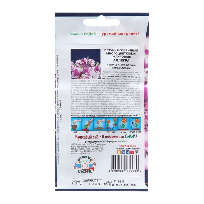 Гибридная смесь крупноцветковой махровой петунии с роскошными пышными цветками. Может использоваться для срезки! Растение мощное, прямостоячее, ветвистое, высотой 100-110 см, ширина куста 50-60 см. Цветки одиночные, махровые, крупные, диаметром 10-12 см, различной расцветки: белой, розовой, лососевой, пурпурной. Петуния свето- и теплолюбива, предпочитает суглинистые и супесчаные, водопроницаемые, плодородные почвы. Не выносит сырых и кислых почв. При выращивании в контейнерах их объём должен быть достаточно большим, не менее 20-25 см. Для обильного цветения необходим регулярный полив и частые подкормки полным минеральным удобрением, чтобы растение могло показать себя во всей красе. Посев семян на рассаду проводят в конце Февраля-Марте. Семена слегка вдавливают в почву, не присыпая землей, хорошо увлажняют из распылителя. При попадании влаги на гранулу оболочка должна раствориться. Посевы накрывают стеклом или целлофаном для сохранения постоянной влажности и до полных всходов, ставят в освещенное место. Рассаду высаживают в открытый грунт через 7-9 недель или после окончания весенних заморозков. Идеально подходит для всех типов использования: для горшков, контейнеров, подвесных корзин, для ваз в срезке.Оптимальная для прорастания семян температура почвы 20-25º С.