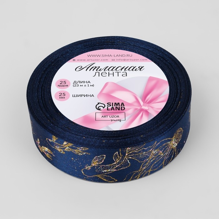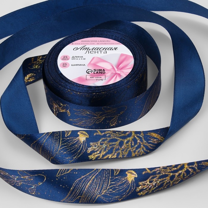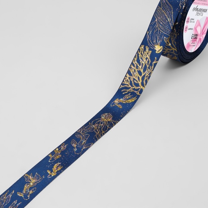 Лента атласная с тиснением «Океан», 25 мм × 23 ± 1 м, цвет тёмно-синий/голография