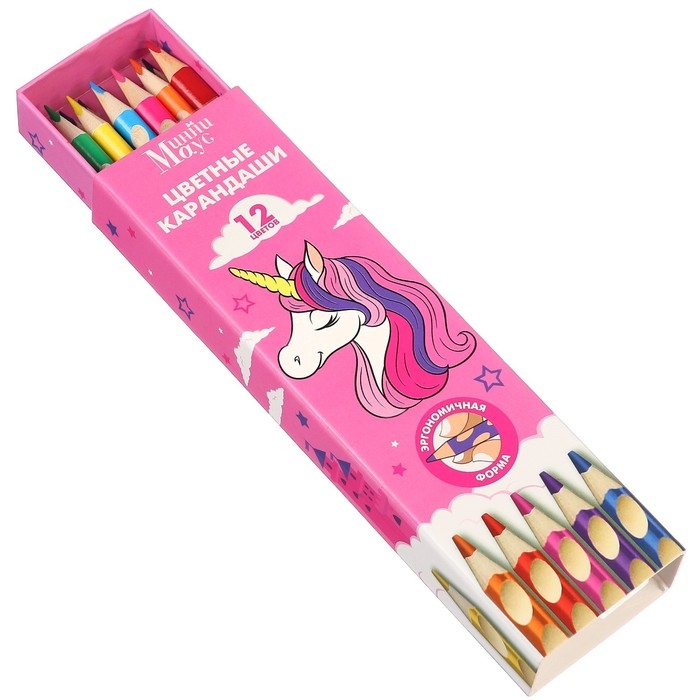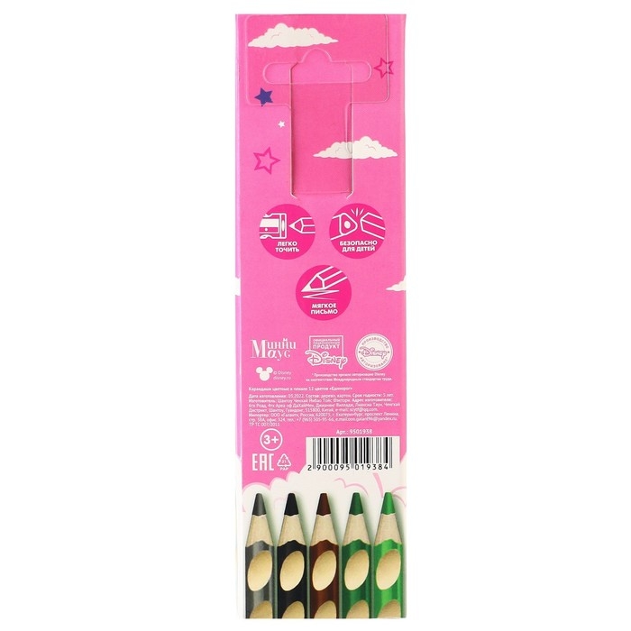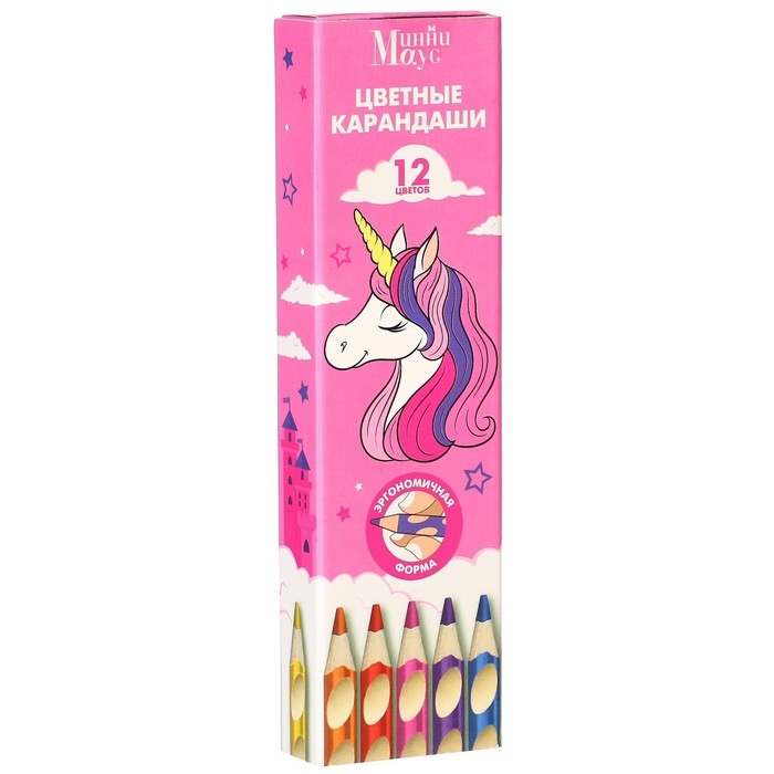 Цветные карандаши, 12 цветов, трехгранные, Минни Маус и Единорог