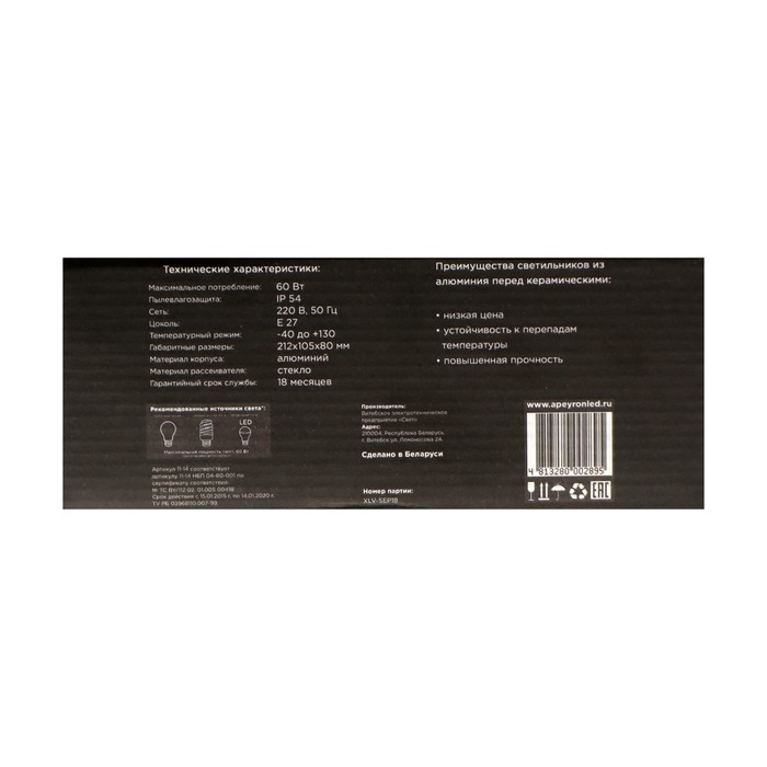 Светильник подойдёт для освещения внутренних помещений и открытых площадей административно-бытовых, производственных помещений и мест общественного пользования. Алюминиевый корпус и стеклянный рассеиватель не плавятся и легко моются. Высокая термостойкость и защита от пыли и влаги позволяют расположить светильник в бане и сауне. Диапазон рабочих температур составляет от -45 °C до +130 °C.