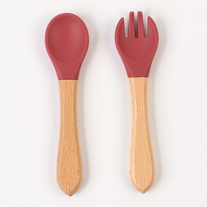 Набор детский столовых приборов, вилка и ложка M&B (силикон, бамбук), вишня