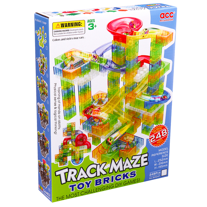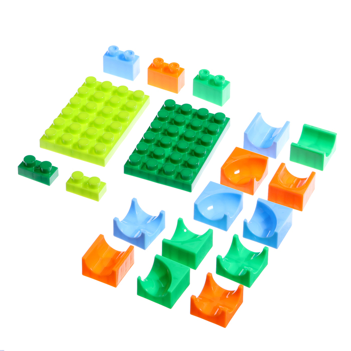 Набор состоит блочных элементов, разноцветных мостиков и извилистых дорожек. Малыш без труда соорудит трассу любой длины и сложности и будет следить за перемещениями шариков.