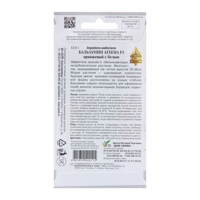 Семена цветов Бальзамин "Атхена F1" оранжевый с белым, 5 шт