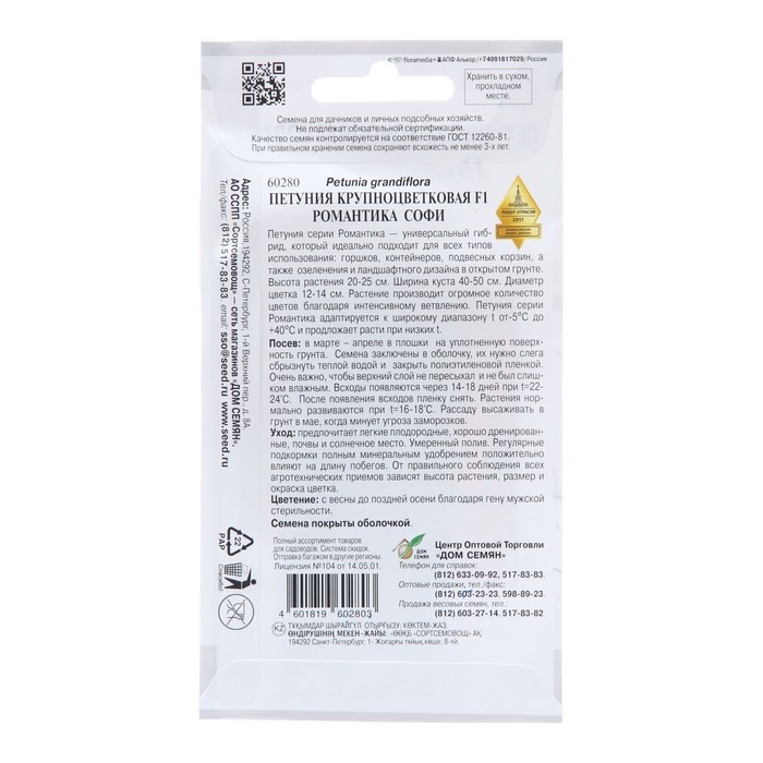Петуния серии Романтика — универсальный гибрид, который идеально подходит для всех типов использования: горшков, контейнеров, подвесных корзин, а также озеленения и ландшафтного дизайна в открытом грунте. Высота растения 20-25 см. Ширина куста 40-50 см. Диаметр цветка 12-14 см.Растение производит огромное количество цветов благодаря интенсивному ветвлению. Петуния серии Романтика адаптируется к широкому диапазону t от-5ºС до +40ºС и продложает расти при низких t.Посев: в марте – апреле в плошки на уплотненную поверхность грунта. Семена заключены в оболочку, их нужно слега сбрызнуть теплой водой и закрыть полиэтиленовой пленкой. Очень важно, чтобы верхний слой не пересыхал и не был слишком влажным. Всходы появляются через 14-18 дней при t=22-240С. После появления всходов пленку снять. Растения нормально развиваются при t=16-180С. Рассаду высаживать в грунт в мае, когда минует угроза заморозков.Уход: предпочитает легкие плодородные, хорошо дренированные, почвы и солнечное место. Умеренный полив. Регулярные подкормки полным минеральным удобрением положительно влияют на длину побегов. От правильного соблюдения всех агротехнических приемов зависят высота растения, размер и окраска цветка. Семена покрыты оболочкой.Цветение: с весны до поздней осени благодаря гену мужской стерильности.