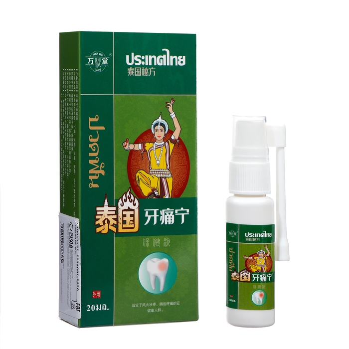 Спрей от зубной боли, 20 мл - представляет собой тайский продукт, специально разработанный для эффективного облегчения зубной боли, опухших десен, пародонтита и других проблем в области полости рта. Этот спрей содержит извлеченные растительные ингредиенты, предназначенные для безопасного и эффективного облегчения зубной боли, при этом минимизируя возможные побочные эффекты.
