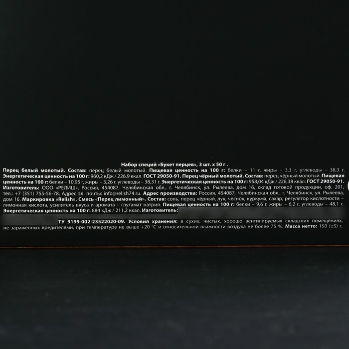 Набор специй «Букет перцев» для блюд: белый перец, чёрный и лимонный, 150 г (3 шт. х 50 г).