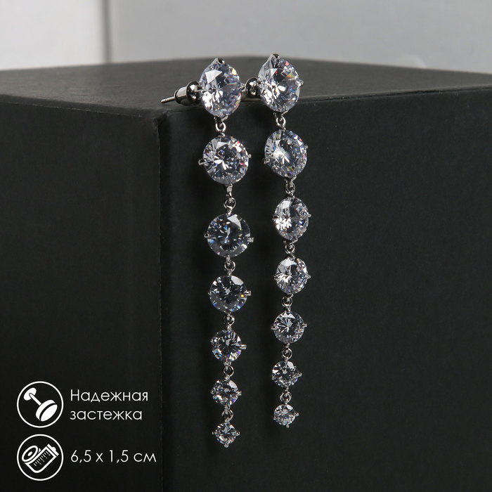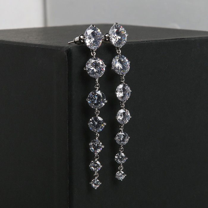 Серьги висячие со стразами «Капли» дорожка, цвет чёрный в серебре, 6,2 см
