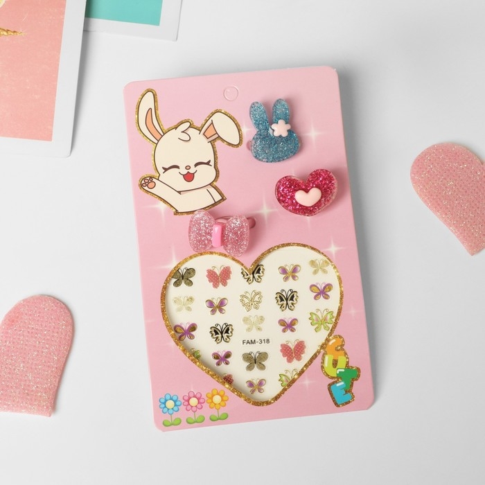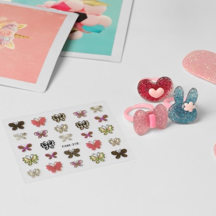 Комплект детский «Выбражулька» 4 предмета: 3 кольца, наклейки на ногти, форма МИКС, цветной