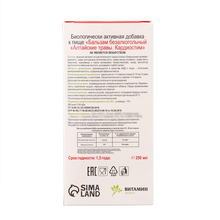 Бальзам безалкогольный "Красногорье" защита сердца, 250 мл