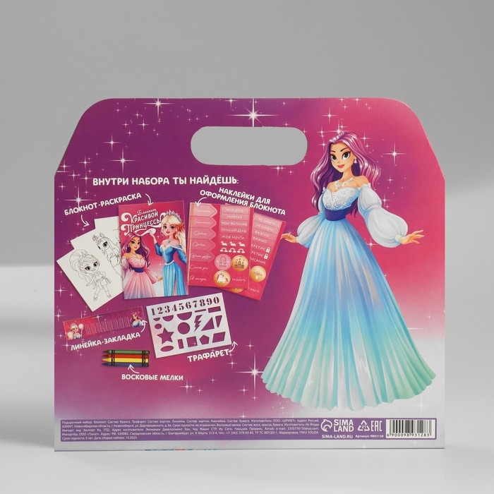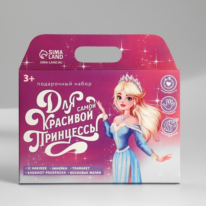 Подарочный набор блокнот-раскраска, трафарет, наклейки и восковые мелки «Для самой красивой принцессы»