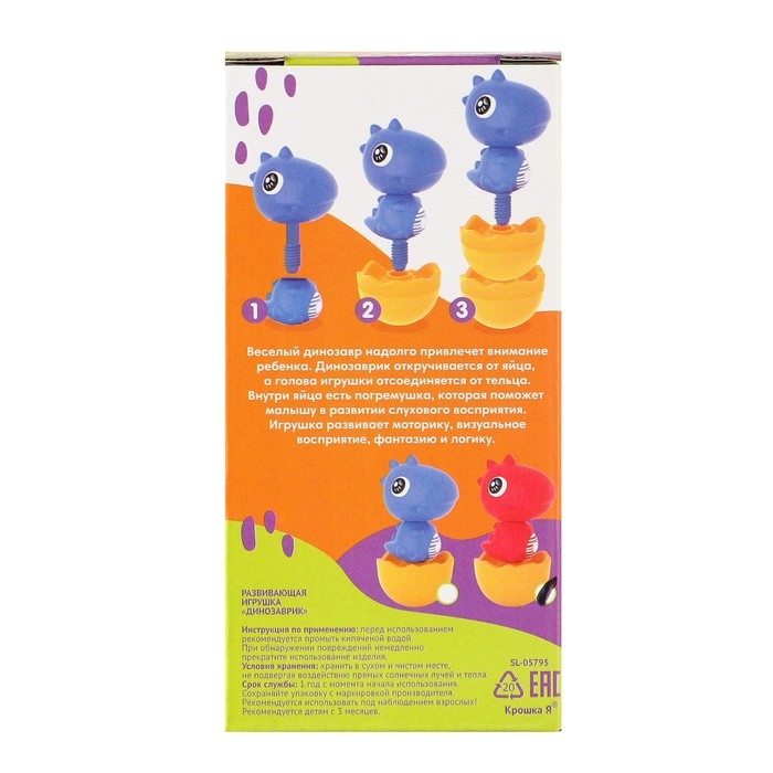 Веселый динозавр надолго привлечет внимание ребенка. Динозаврик откручивается от яйца, а голова игрушки отсоединяется от тельца. Внутри яйца есть погремушка, которая поможет малышу в развитии слухового восприятия. Игрушка развивает моторику, визуальное восприятие, фонтозию и логику.