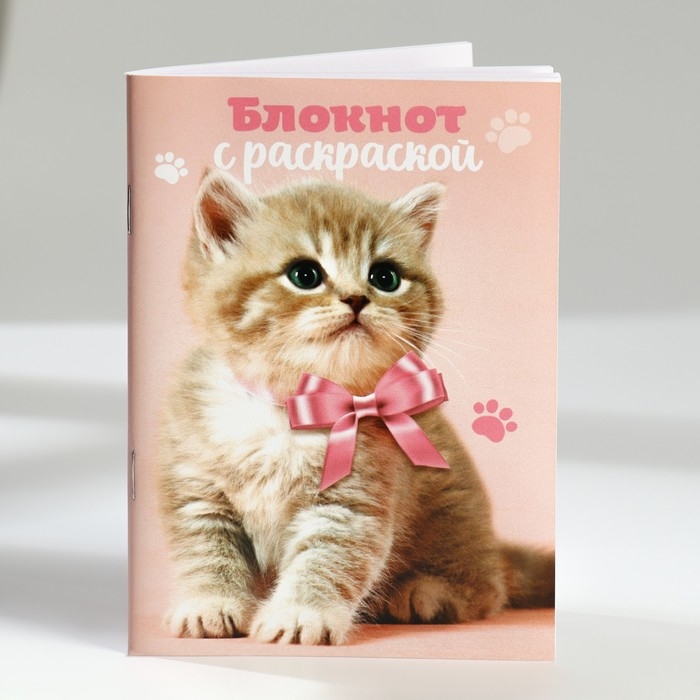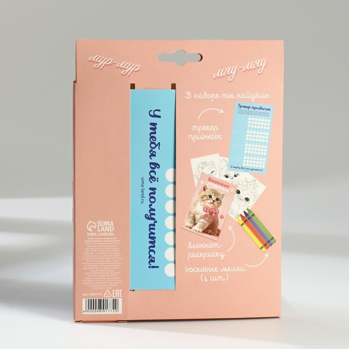 Подарочный набор блокнот-раскраска А6, трекер привычек и восковые мелки «Котенок»