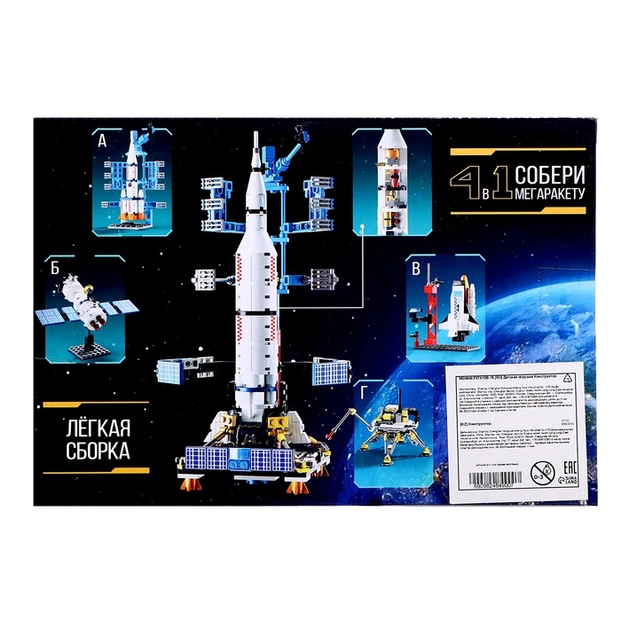 - 4 в 1. Набор позволяет собрать несколько разных моделей, в том числе мегаракету. Поэтому ребёнок сможет фантазировать и придумывать любые конструкции.