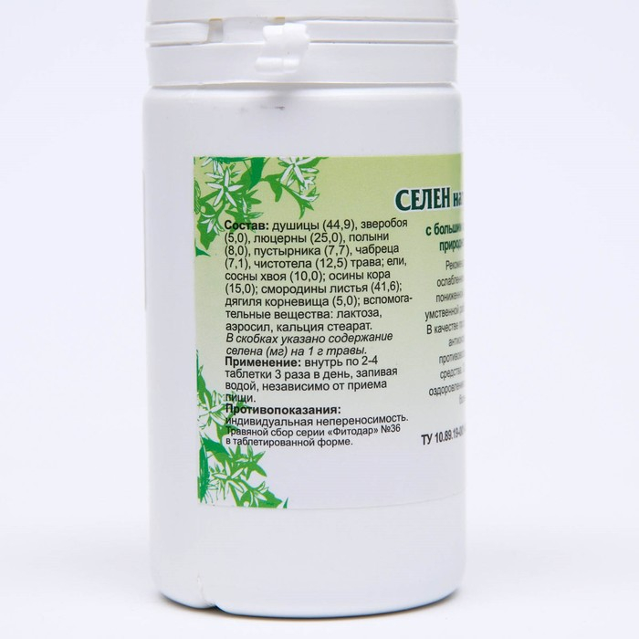 Состав: душицы (44,9), зверобоя (5,0), люцерны (25,0), полыни (8,0), пустырника (7,7), чабреца (7,1), чистотела (12,5) трава; ели, сосны (10,0) хвоя; осины (15,0) кора; смородины (41,6) листья. В скобках указано содержание селена (мг) на 1 г травы, вспомогательные вещества: лактоза, аэросил, кальция стеарат.