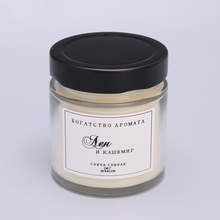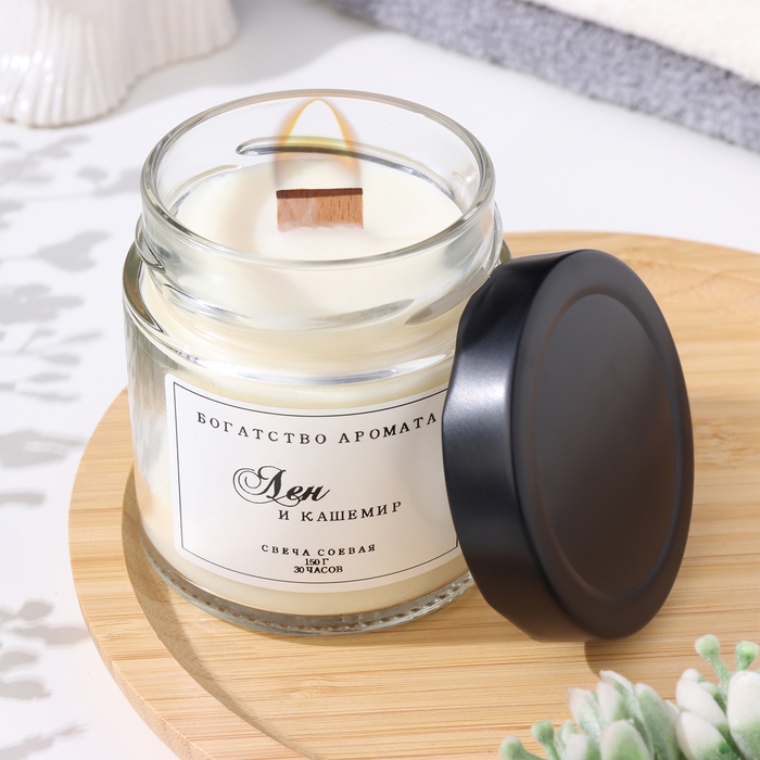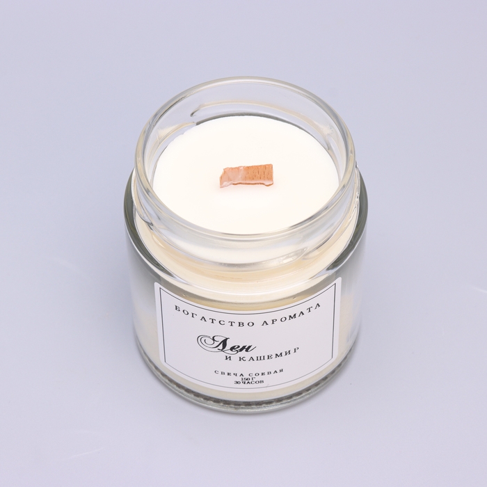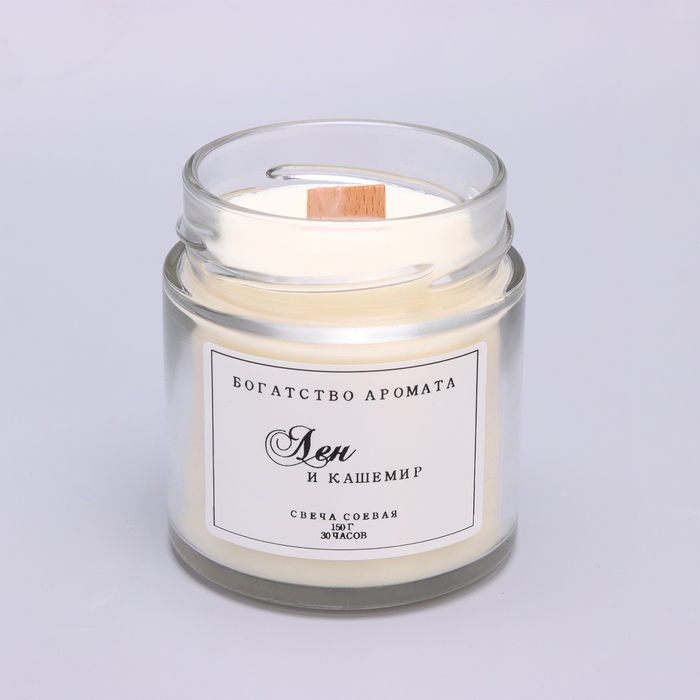Свеча ароматическая из соевого воска в банке, 150 г, деревянный фитиль, лен и кашемир