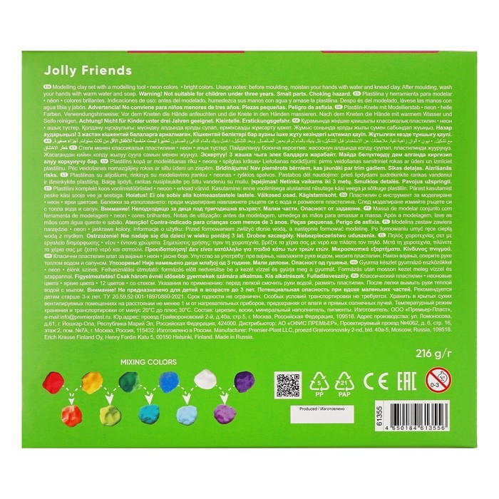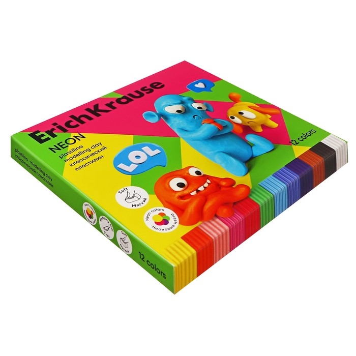Палитра содержит яркие неоновые цвета, которые отлично смешиваются между собой и пластилином из классической серии, создавая новые оттенки. Удлиненная форма бруска позволяет легко отделить необходимое количество пластилина для работы. Каждый брусок имеет индивидуальную упаковку «flow-pack», которая надежно сохраняет товарный вид и пластичные свойства продукта. Пластилин упакован в картонную коробку без коррекса. В комплекте для декорирования и моделирования прилагается стек.