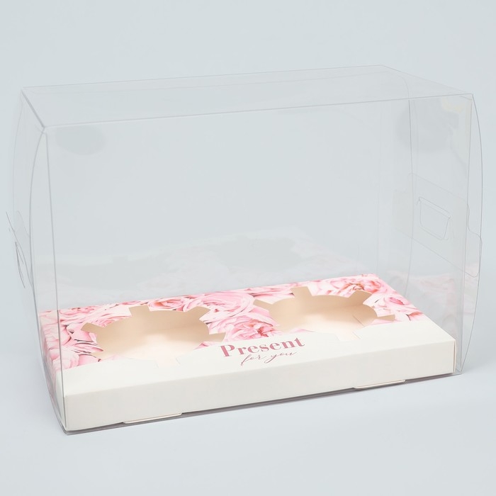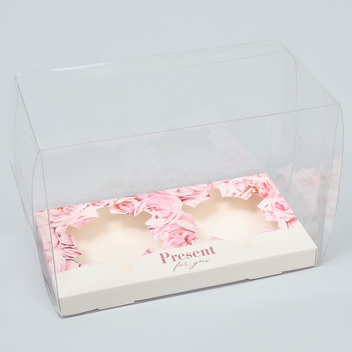Коробка для капкейка, кондитерская упаковка, 2 ячейки «Розовые цветы», 16 х 8 х 11.5 см