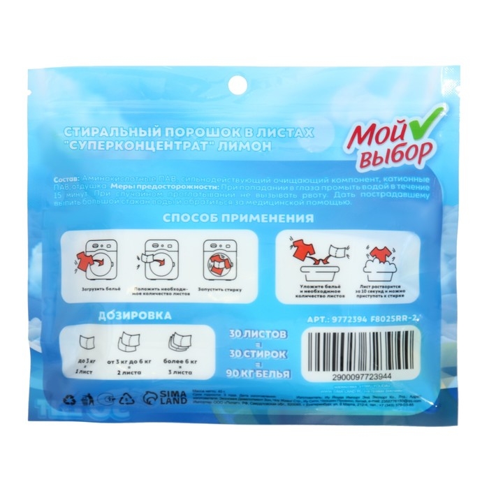 Упаковка содержит 30 листов, что обеспечит длительное использование. Стиральный порошок в листах "Мой выбор" - это надежный помощник в уходе за вашими вещами. Он обеспечивает чистоту и свежесть, а также сохраняет первоначальный вид и качество тканей.