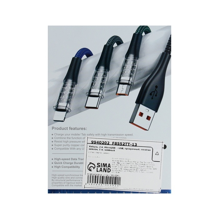 Кабель, 2 А, MicroUSB - USB, прозрачный, оплётка нейлон, 1 м, зелёный