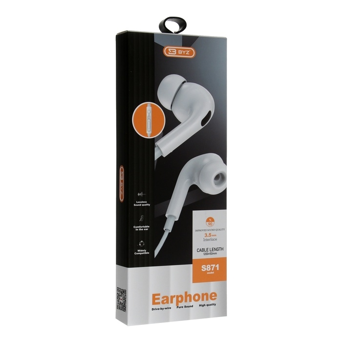 Наушники BYZ S871, проводные, вакуумные, микрофон, 3.5 мм, 1.2 м, белые