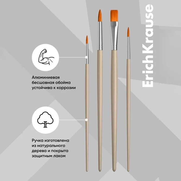 Кисти ErichKrause для рисования акварельными красками и гуашью изготовлены из синтетики. Рабочая часть кисти покрыта гуммирующим составом, защищающим ее при хранении и транспортировке. Ручка изготовлена из натурального дерева и покрыта защитным лаком. Цельнометаллическая бесшовная обойма из алюминия устойчива к коррозии.