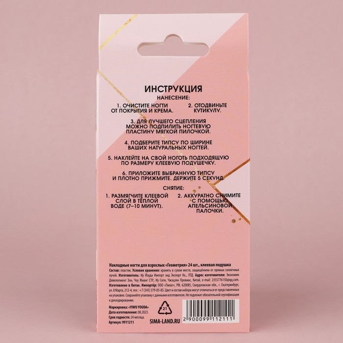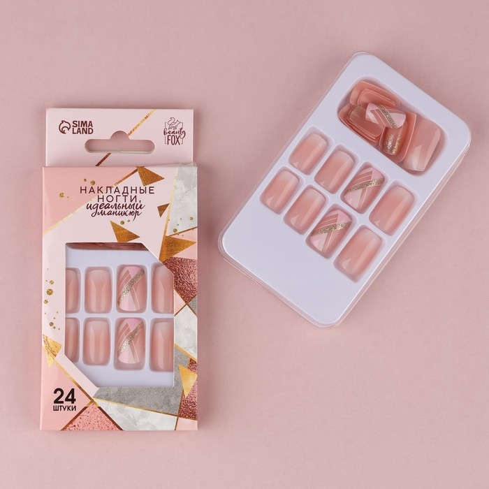 Накладные ногти «Геометрия», 24 шт, клеевые пластины, форма квадрат, цвет розовый/золостистый
