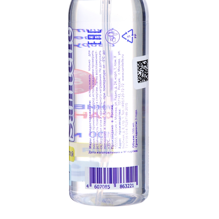 Спрей Санитель экстрактом Алоэ-вера представлен в объеме 100 мл, что делает его удобным для использования как дома, так и в общественных местах. Он легко наносится на кожу и быстро высыхает, не оставляя липких следов.