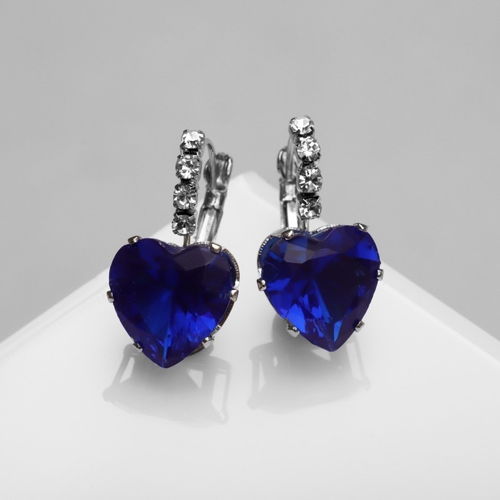 Серьги со стразами «Сердце» мерцание, цвет синий в серебре