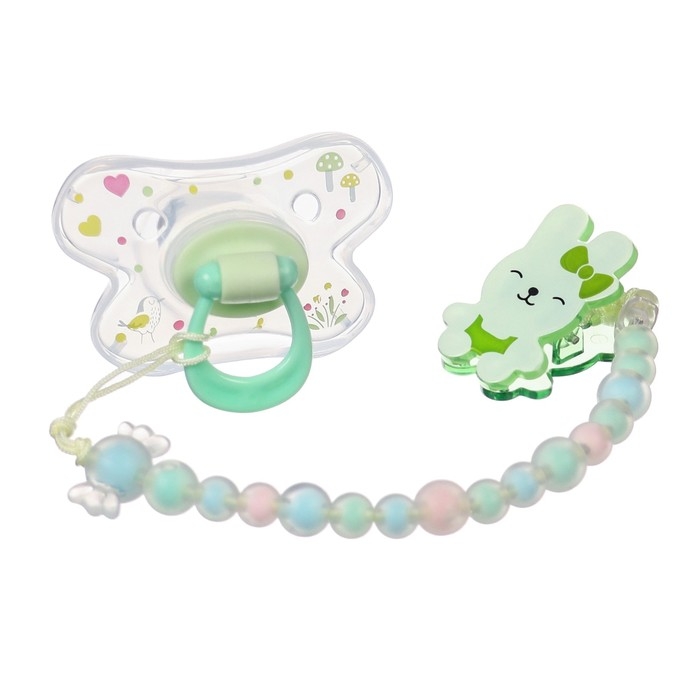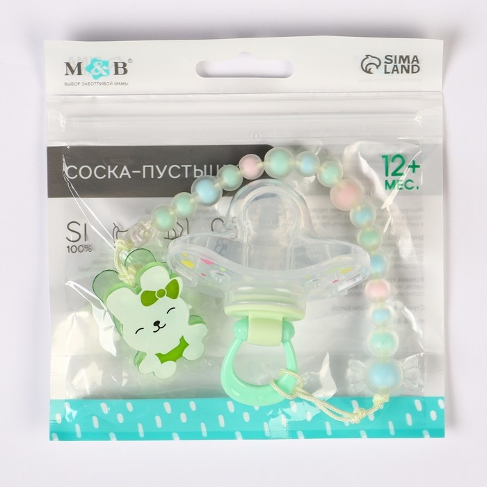 Соска - пустышка силиконовая ортодонтическая, от 12 мес., с колпачком + держатель «Зайка», цвет зеленый