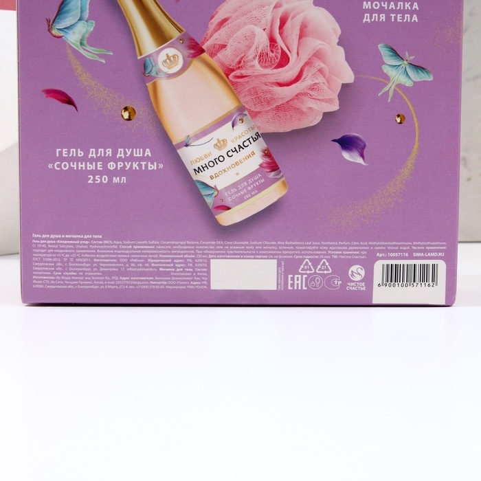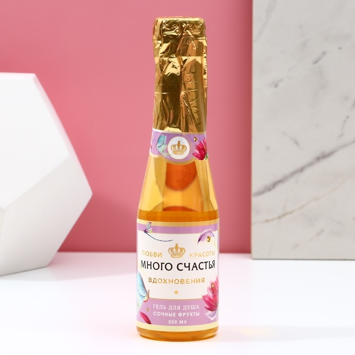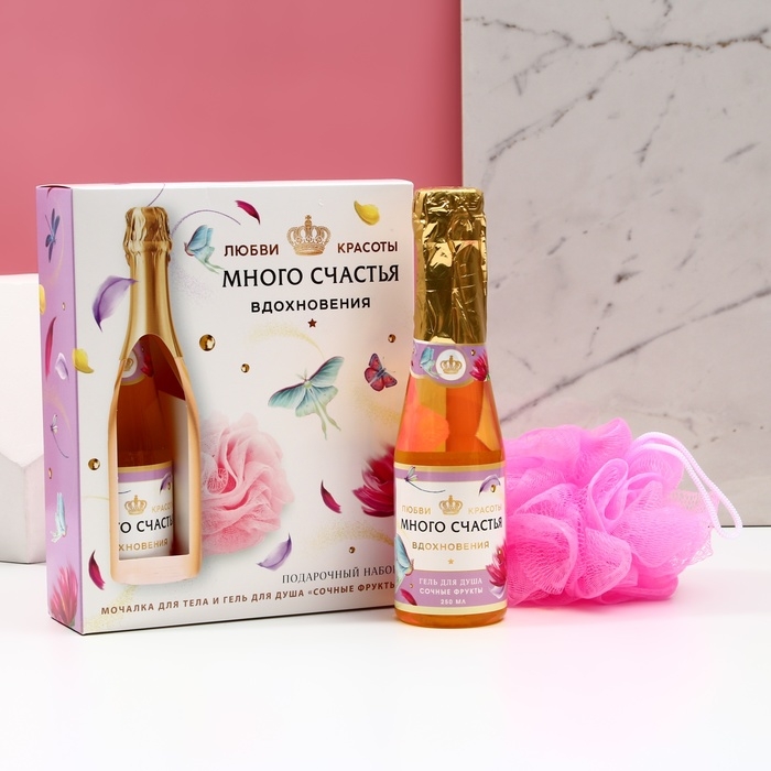 Подарочный набор косметики «Много счастья!», гель для душа во флаконе шампанское 250 мл и мочалка для тела, ЧИСТОЕ СЧАСТЬЕ
